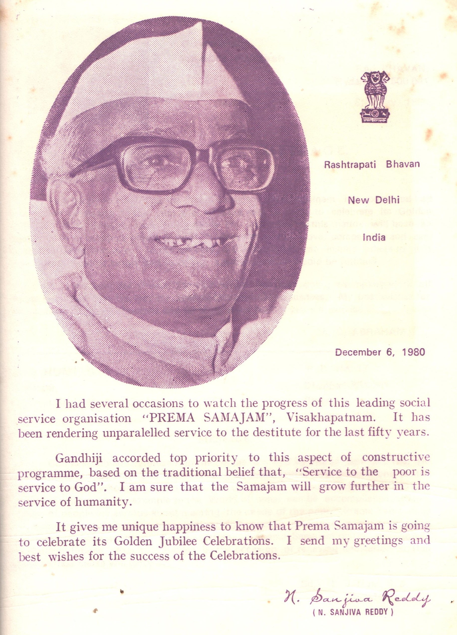It gives me unique happiness to known that Prema Samajam is going to celebrate its Golden Jubilee Celebrations. I send my greetings and best wishes for the success of the Celebrations.